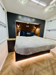 FEATURING A COMBINATION OF NAVY AND PALE BLUE CABINETRY, CHEVRON FLOORING, WARM LED LIGHTING AND KING SIZE BED MAKES FOR A VERY INVITING INTERIOR