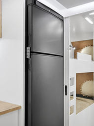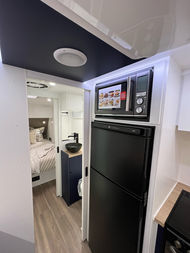 A COMBINATION OF DEEP NAVY, LUUK OAK AND LIGHT UPHOLSTERY MAKE FOR A SPACE INDICATIVE OF THE CUSTOMERS OWN HOME, A RETREAT ON WHEELS, CUSTOMER OPTING FOR A MINI GRILL AND COMBIWAVE 3 IN 1 CONVECTION MICROWAVE.